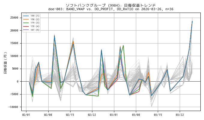 昨日の(クロス・シグナル無しという)悔しい結果を目にして、急遽、準備していた VWAP のバンド線を実装、妥当なバンド幅の見当を付けるため一晩かけて DOE によるバックテストを実施しました[189 条件 × 35 日 + 当日分]。