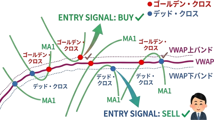 VWAP のバンド線の概念図を(苦心の末)Google Gemini に作成してもらいました。MA1 が VWAP 近くまできてクロスせずに反転してしまうケースへの対策です。実績がないのでこれだけでは浅はかで想定が甘いかもしれません。