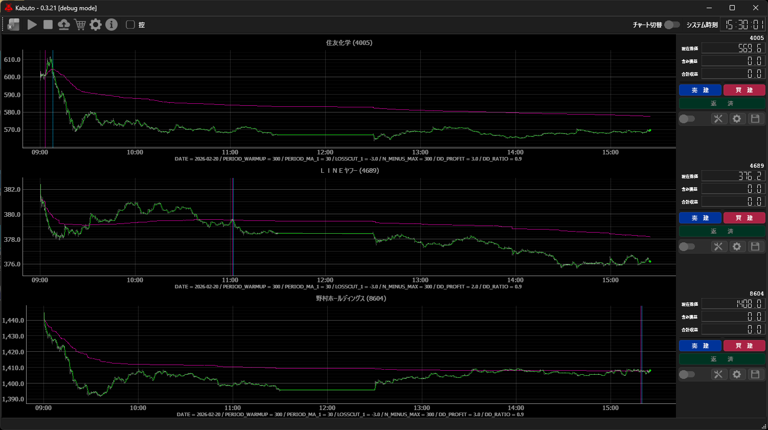 本アプリは短周期の移動平均線 MA1 と VWAP トレンド線のクロス・シグナルをエントリの判断基準にしています。また、現在のところ注文数量を 100 株に固定しています。