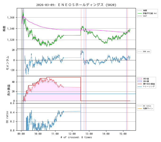 ENEOSホールディングス (5020) はうまく下降トレンドに乗れました。前引けにかけて値を戻してきましたが、そのまま後場まで持ち越してみました。