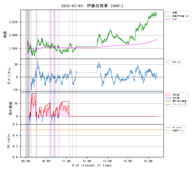 一方、伊藤忠商事 (8001) は、寄り付いた後の方向を見極めることができずに無駄なエントリを繰り返してしまいました。