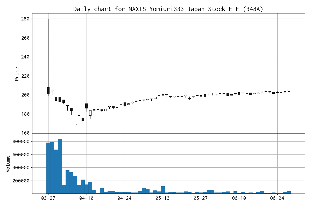 この読売株価指数に連動する上場投資信託 (ETF)、MAXIS読売333日本株上場投信(MXS読売333日株【略称】)(348A) が 3 月 27 日に東京証券取引所へ上場しました。まだデータ数が少ないのですが、日足のローソク足チャートを作成しました。