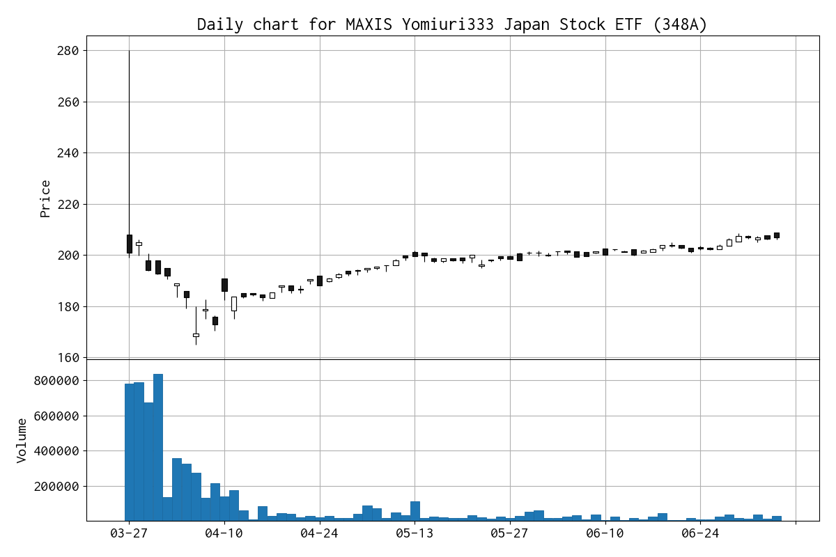 この読売株価指数に連動する上場投資信託 (ETF)、MAXIS読売333日本株上場投信(MXS読売333日株【略称】)(348A) が 3 月 27 日に東京証券取引所へ上場しました。まだデータ数が少ないのですが、日足のローソク足チャートを作成しました。