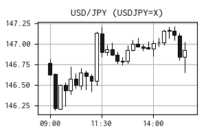 今日は、ザラ場中にドル円の為替レートも大きく動きました(左のチャートは 15 分足)。