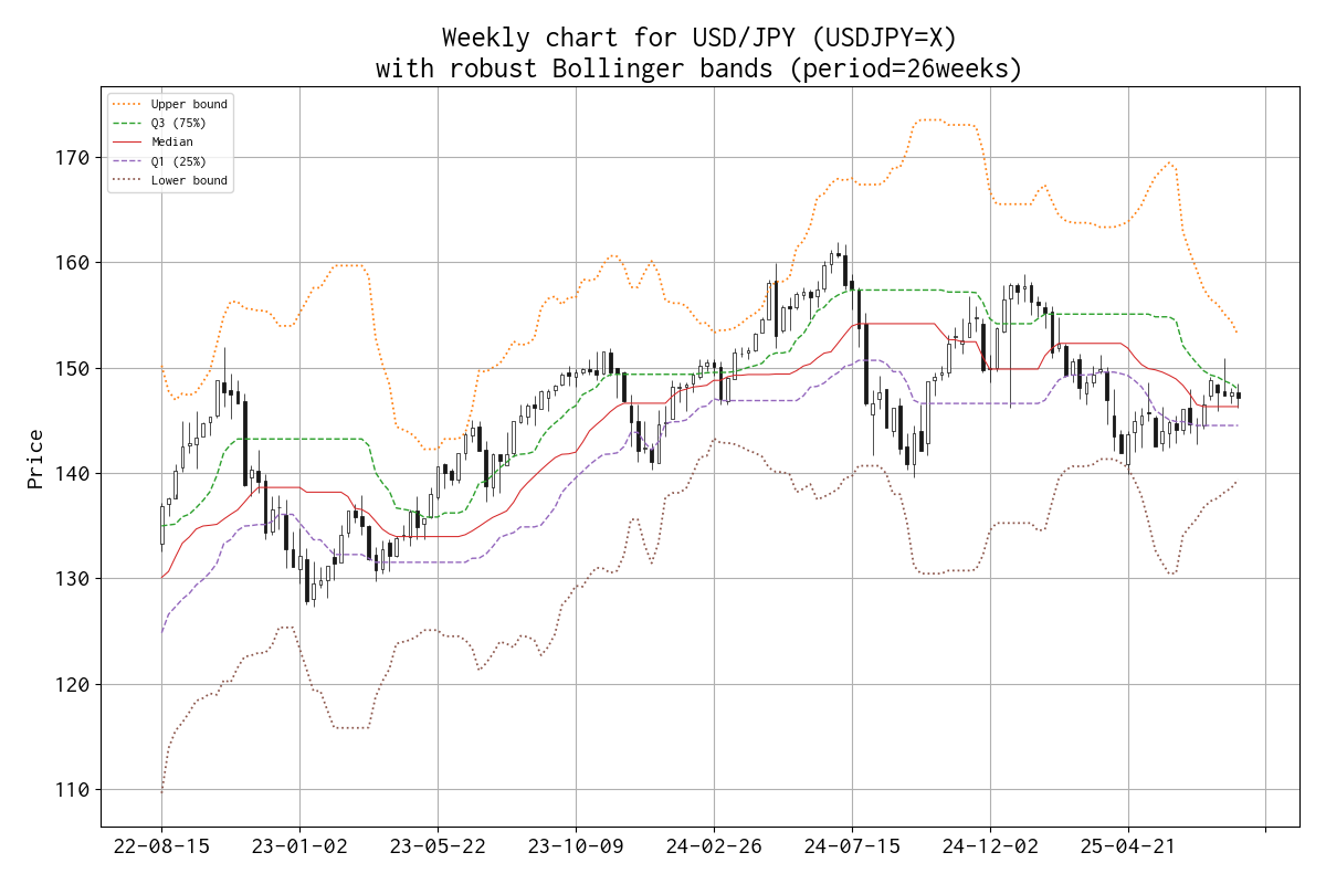 平均と標準偏差を、median と IQR(Q1 25% と Q3 75%)に置き換えたボリンジャーバンド(勝手に robust Bollinger bands と呼んでいます)のチャートを示しました。
