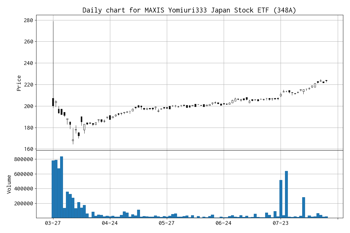 この読売株価指数に連動する上場投資信託 (ETF)、MAXIS読売333日本株上場投信(MXS読売333日株【略称】)(348A) が 3 月 27 日に東京証券取引所へ上場しました。日足のローソク足チャートを作成しました。