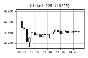今日の日経平均株価は、前日比 188.16 円安の 42,619.66 円で 3 営業日ぶりに反落で始まりました。9:02 に 42,703.27 円の高値を付けた後、下げ幅を広げて 9:48 に 43,137.62 円の安値を付けました。
