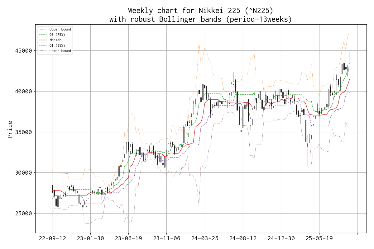 平均と標準偏差を、median と IQR(Q1 25% と Q3 75%)に置き換えたボリンジャーバンド(勝手に robust Bollinger bands と呼んでいます)のチャートを示しました。