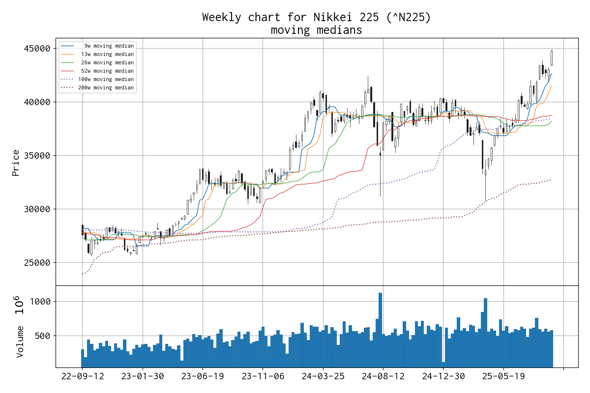 直近の移動メジアン線の値は、 9 週線 42,633 円、 13 週線 41,456 円、 26 週線 38,184 円、 52 週線 38,739 円、 100 週線 38,427 円、 200 週線 32,734 円 でした。