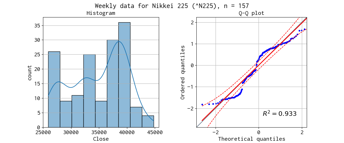 日経平均株価の対象期間のデータのヒストグラムと Q-Q プロットを示しました。