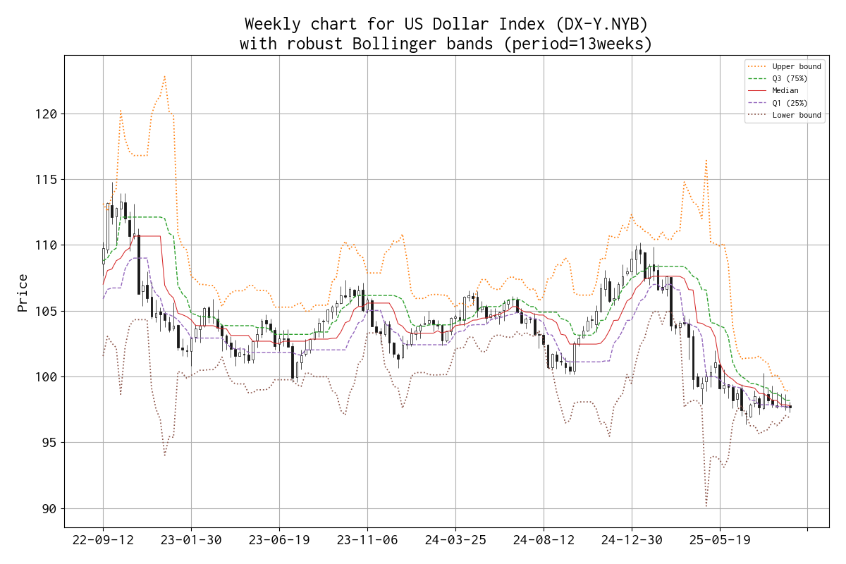平均と標準偏差を、median と IQR(Q1 25% と Q3 75%)に置き換えたボリンジャーバンド(勝手に robust Bollinger bands と呼んでいます)のチャートを示しました。