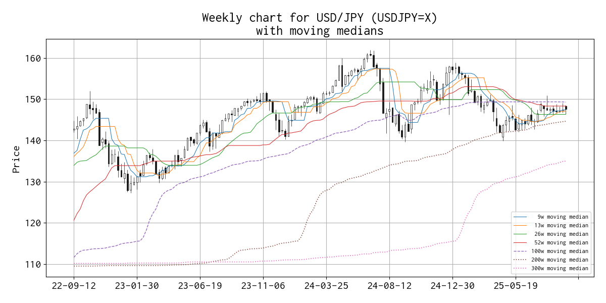 直近の移動メジアン線の値は、 9 週線 147.390 円(2 週連続)、 13 週線 147.120 円、 26 週線 146.302 円(10 週連続)、 52 週線 148.325 円(8 週連続)、 100 週線 149.280 円、 200 週線 144.630 円、 300 週線 134.963 円 でした。
