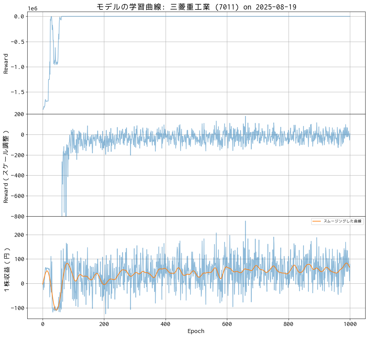- 学習初期に大きく変動しているが、100 Epoch 以降は 0〜+50 円程度に収束。