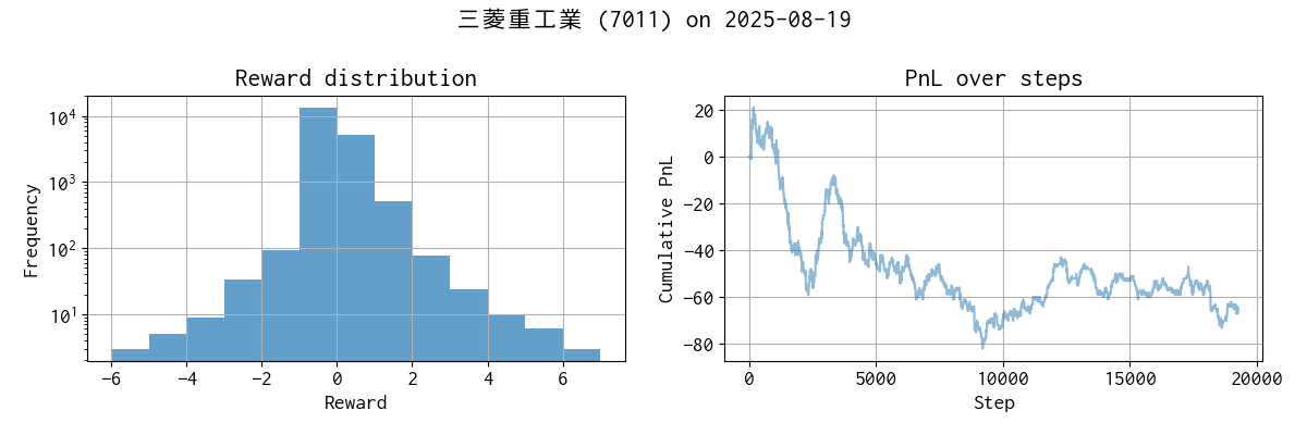 - ただし、その後は Reward がほとんど改善せず「横ばい」。 → 報酬関数がペナルティと利益のバランスで拮抗している可能性があります。