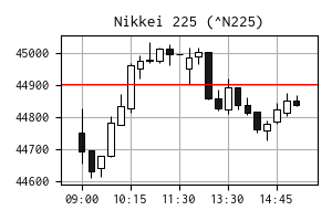 前日比 150.43 円安の 44,751.84 円と 5 営業日ぶりに反落で取引が始まりました。9:19 に 44,612.07 円の安値を付けました。