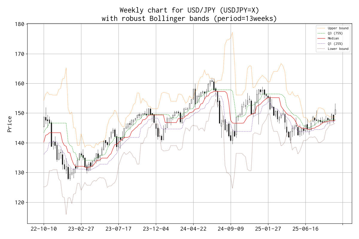 平均と標準偏差を、median と IQR(Q1 25% と Q3 75%)に置き換えたボリンジャーバンド(勝手に robust Bollinger bands と呼んでいます)のチャートを示しました。