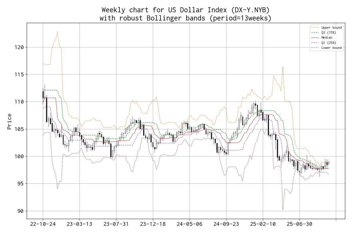 平均と標準偏差を、median と IQR(Q1 25% と Q3 75%)に置き換えたボリンジャーバンド(勝手に robust Bollinger bands と呼んでいます)のチャートを示しました。