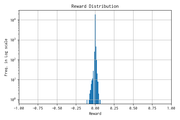 1 ステップの報酬は、tanh で [-1, 1] に収まるようにしていて、追加の「建玉保持に報酬・ペナルティ付与」を例外的にそのまま扱っています。そのため、報酬分布に 1 を超えたものがあります(最後の強制決済時の報酬)。今後、スケーリングの整合性を検討します。