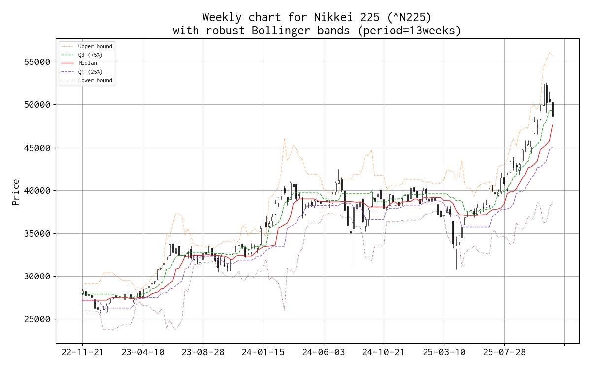 平均と標準偏差を、median と IQR(Q1 25% と Q3 75%)に置き換えたボリンジャーバンド(勝手に robust Bollinger bands と呼んでいます)のチャートを示しました。