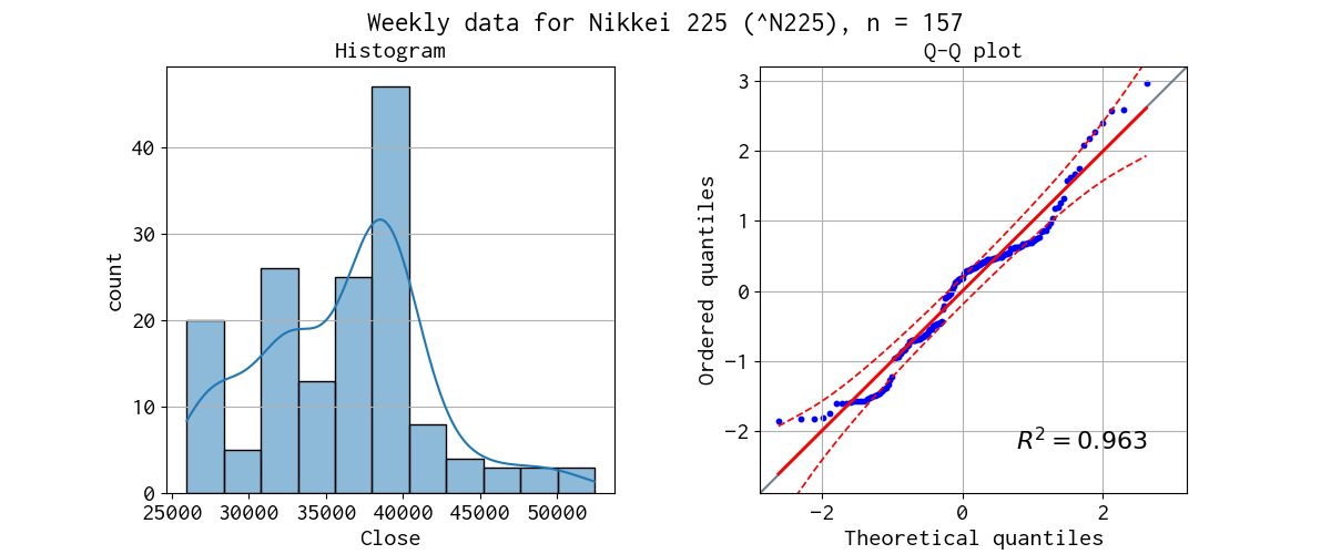 日経平均株価の対象期間のデータのヒストグラムと Q-Q プロットを示しました。