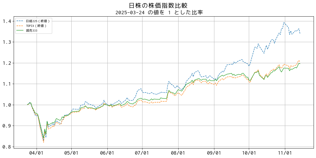 この指数の振る舞いに興味を持ったので、代表的な日本の株価指数である日経平均株価指数(日経225)と東証株価指数 (TOPIX) とのパフォーマンスを比較しています。読売333の公表が始まった 3 月 24 日を 1 として、それぞれの比率をトレンドにしています。