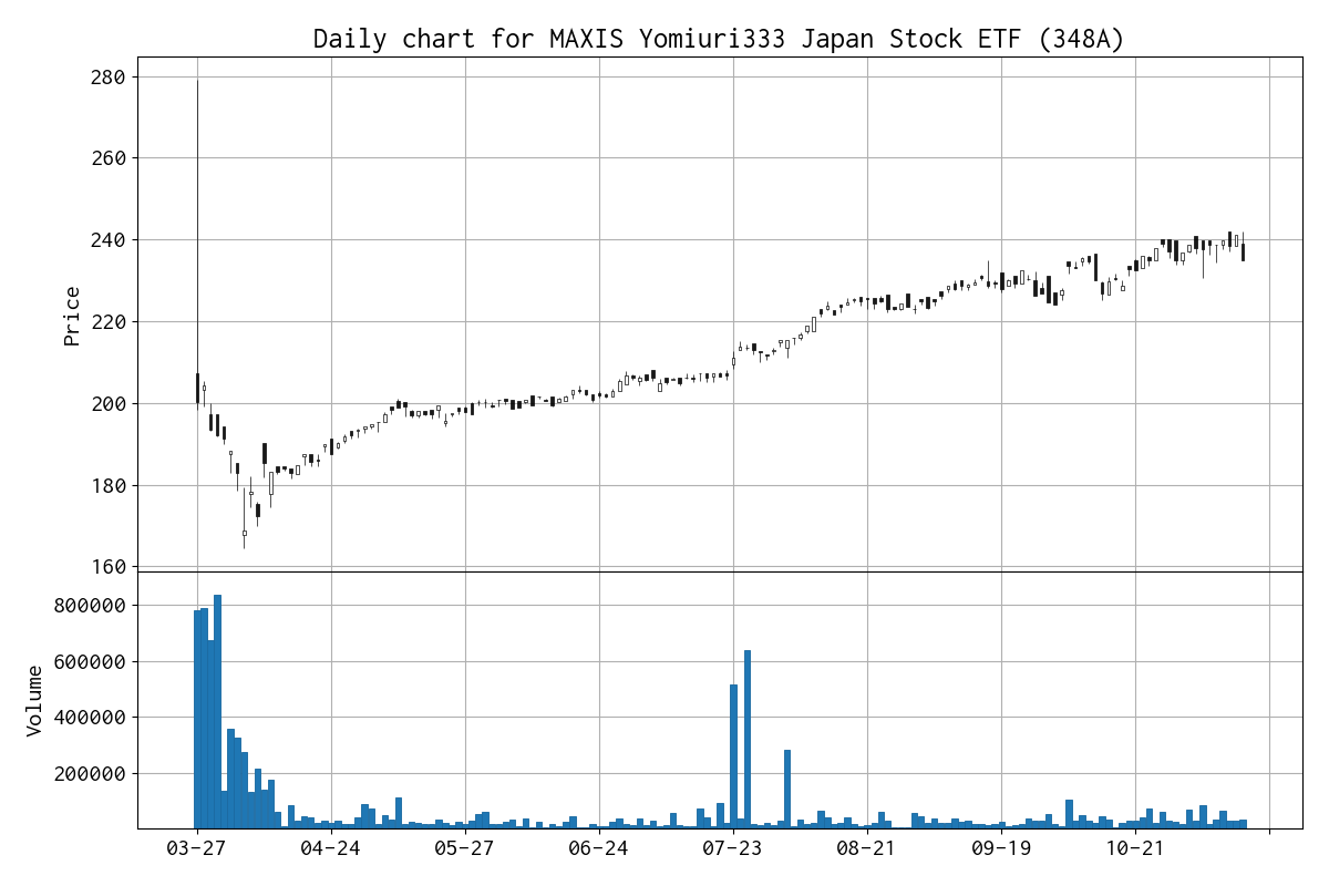 この読売株価指数に連動する上場投資信託 (ETF)、MAXIS読売333日本株上場投信(MXS読売333日株【略称】)(348A) が 3 月 27 日に東京証券取引所へ上場しました。日足のローソク足チャートを作成しました。