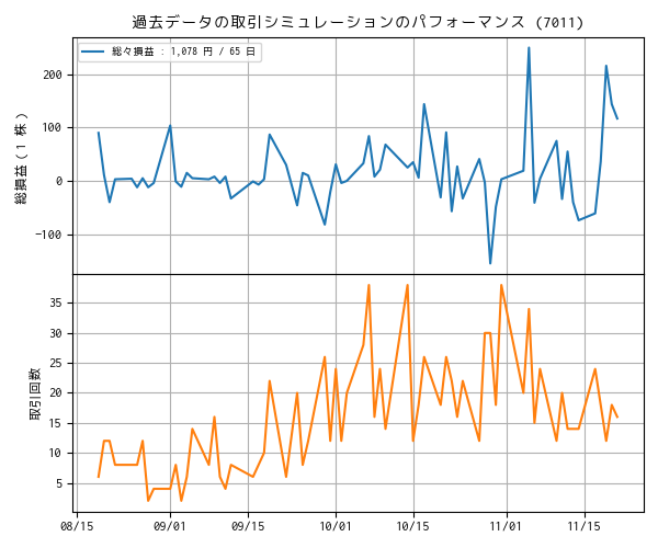 なんだ、こんな単純なアプローチでもそこそこの収益をあげられるのかと、びっくりがっかりでした。適切な損切り処理を加えれば、とりあえず使えるかもしれません。なにより処理が軽いことはメリットです。仮ぎめのパラメータの水準を振って組み合わせて、しらみつぶしに確認してもそれほどの時間はかかりません。銘柄毎に入念な確認が必要ですが、良さげなパラメータが見つかれば、現在の PC 環境でも複数銘柄の取引を同時に動かすことさえできそうです。なにより強化学習モデルに比べれば完全な再現性があります。
