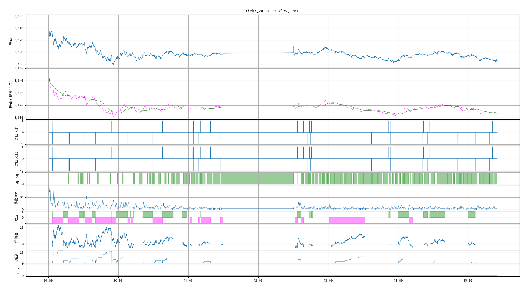 注文日時 銘柄コード 売買 約定単価 約定数量 損益 0 2025-11-27 09:01:17 7011 売建 3927.0 1 NaN 1 2025-11-27 09:01:26 7011 買埋 3933.0 1 -6.0 2 2025-11-27 09:03:24 7011 買建 3932.0 1 NaN 3 2025-11-27 09:03:28 7011 売埋 3929.0 1 -3.0 4 2025-11-27 09:03:29 7011 売建 3929.0 1 NaN 5 2025-11-27 09:12:39 7011 買埋 3921.0 1 8.0 6 2025-11-27 09:12:40 7011 買建 3921.0 1 NaN 7 2025-11-27 09:16:45 7011 売埋 3915.0 1 -6.0 8 2025-11-27 09:17:00 7011 売建 3915.0 1 NaN 9 2025-11-27 09:26:24 7011 買埋 3916.0 1 -1.0 10 2025-11-27 09:26:25 7011 買建 3916.0 1 NaN 11 2025-11-27 09:30:18 7011 売埋 3913.0 1 -3.0 12 2025-11-27 09:30:19 7011 売建 3913.0 1 NaN 13 2025-11-27 09:30:32 7011 買埋 3914.0 1 -1.0 14 2025-11-27 09:30:33 7011 買建 3914.0 1 NaN 15 2025-11-27 09:31:27 7011 売埋 3908.0 1 -6.0 16 2025-11-27 09:31:34 7011 売建 3908.0 1 NaN 17 2025-11-27 09:37:16 7011 買埋 3911.0 1 -3.0 18 2025-11-27 09:37:17 7011 買建 3911.0 1 NaN 19 2025-11-27 09:40:19 7011 売埋 3906.0 1 -5.0 20 2025-11-27 09:40:20 7011 売建 3906.0 1 NaN 21 2025-11-27 09:54:12 7011 買埋 3890.0 1 16.0 22 2025-11-27 09:54:13 7011 買建 3889.0 1 NaN 23 2025-11-27 09:54:41 7011 売埋 3886.0 1 -3.0 24 2025-11-27 09:54:42 7011 売建 3886.0 1 NaN 25 2025-11-27 09:58:01 7011 買埋 3888.0 1 -2.0 26 2025-11-27 09:58:02 7011 買建 3888.0 1 NaN 27 2025-11-27 10:08:08 7011 売埋 3893.0 1 5.0 28 2025-11-27 10:08:09 7011 売建 3893.0 1 NaN 29 2025-11-27 10:10:07 7011 買埋 3899.0 1 -6.0 30 2025-11-27 10:10:08 7011 買建 3899.0 1 NaN 31 2025-11-27 10:10:43 7011 売埋 3893.0 1 -6.0 32 2025-11-27 10:10:48 7011 売建 3894.0 1 NaN 33 2025-11-27 10:12:32 7011 買埋 3897.0 1 -3.0 34 2025-11-27 10:12:33 7011 買建 3897.0 1 NaN 35 2025-11-27 10:13:21 7011 売埋 3896.0 1 -1.0 36 2025-11-27 10:21:03 7011 買建 3895.0 1 NaN 37 2025-11-27 10:29:35 7011 売埋 3894.0 1 -1.0 38 2025-11-27 10:29:36 7011 売建 3894.0 1 NaN 39 2025-11-27 10:37:59 7011 買埋 3893.0 1 1.0 40 2025-11-27 10:38:00 7011 買建 3893.0 1 NaN 41 2025-11-27 10:47:02 7011 売埋 3898.0 1 5.0 42 2025-11-27 10:54:39 7011 買建 3897.0 1 NaN 43 2025-11-27 10:58:41 7011 売埋 3895.0 1 -2.0 44 2025-11-27 11:01:12 7011 売建 3894.0 1 NaN 45 2025-11-27 11:03:02 7011 買埋 3896.0 1 -2.0 46 2025-11-27 11:03:03 7011 買建 3896.0 1 NaN 47 2025-11-27 11:03:20 7011 売埋 3895.0 1 -1.0 48 2025-11-27 11:08:34 7011 売建 3895.0 1 NaN 49 2025-11-27 11:09:54 7011 買埋 3897.0 1 -2.0 50 2025-11-27 11:10:38 7011 買建 3897.0 1 NaN 51 2025-11-27 11:10:55 7011 売埋 3895.0 1 -2.0 52 2025-11-27 11:10:56 7011 売建 3895.0 1 NaN 53 2025-11-27 11:19:06 7011 買埋 3895.0 1 0.0 54 2025-11-27 11:27:28 7011 売建 3896.0 1 NaN 55 2025-11-27 11:29:51 7011 買埋 3899.0 1 -3.0 56 2025-11-27 12:31:26 7011 売建 3894.0 1 NaN 57 2025-11-27 12:33:32 7011 買埋 3898.0 1 -4.0 58 2025-11-27 12:33:33 7011 買建 3898.0 1 NaN 59 2025-11-27 12:36:44 7011 売埋 3897.0 1 -1.0 60 2025-11-27 12:36:45 7011 売建 3897.0 1 NaN 61 2025-11-27 12:38:53 7011 買埋 3899.0 1 -2.0 62 2025-11-27 12:43:58 7011 買建 3900.0 1 NaN 63 2025-11-27 12:44:45 7011 売埋 3899.0 1 -1.0 64 2025-11-27 12:45:35 7011 買建 3900.0 1 NaN 65 2025-11-27 12:46:54 7011 売埋 3897.0 1 -3.0 66 2025-11-27 13:00:47 7011 売建 3901.0 1 NaN 67 2025-11-27 13:31:40 7011 買埋 3892.0 1 9.0 68 2025-11-27 13:51:54 7011 買建 3889.0 1 NaN 69 2025-11-27 13:53:03 7011 売埋 3887.0 1 -2.0 70 2025-11-27 13:59:55 7011 買建 3886.0 1 NaN 71 2025-11-27 14:09:17 7011 売埋 3890.0 1 4.0 72 2025-11-27 14:09:18 7011 売建 3890.0 1 NaN 73 2025-11-27 14:12:28 7011 買埋 3893.0 1 -3.0 74 2025-11-27 14:21:46 7011 買建 3896.0 1 NaN 75 2025-11-27 14:25:12 7011 売埋 3895.0 1 -1.0 76 2025-11-27 14:27:01 7011 買建 3896.0 1 NaN 77 2025-11-27 14:39:59 7011 売埋 3898.0 1 2.0 78 2025-11-27 14:59:50 7011 買建 3894.0 1 NaN 79 2025-11-27 15:06:01 7011 売埋 3892.0 1 -2.0 取引回数 : 80 回, 一株当りの損益 : -37.0 円