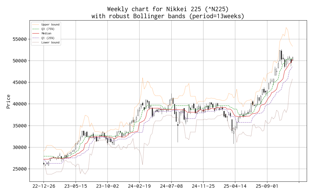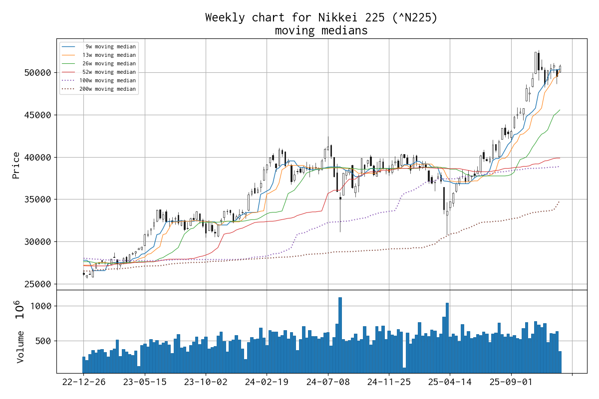 直近の移動メジアン線の値は、 9 週線 50,376 円、 13 週線 50,253 円、 26 週線 45,562 円、 52 週線 39,856 円(2 週連続)、 100 週線 38,898 円、 200 週線 34,877 円 でした。