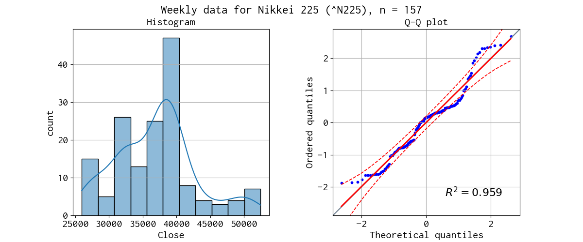 日経平均株価の対象期間のデータのヒストグラムと Q-Q プロットを示しました。