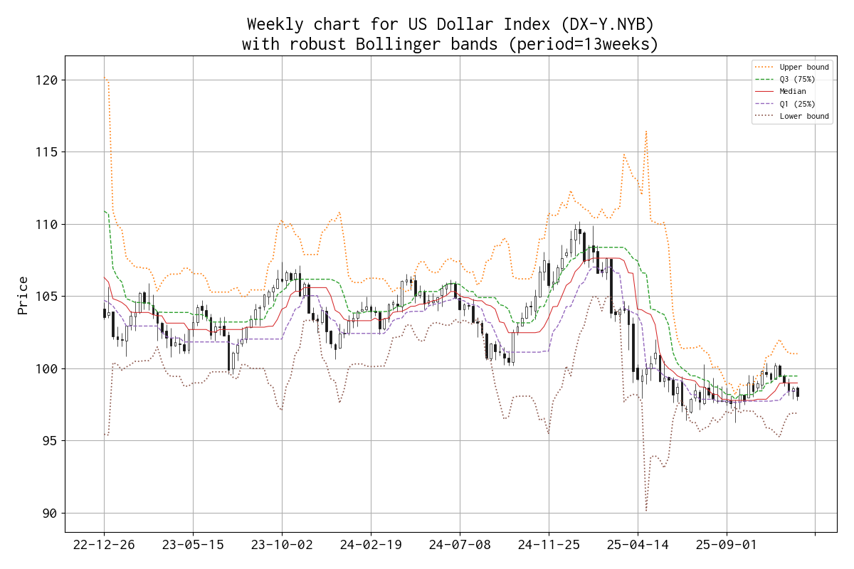 平均と標準偏差を、median と IQR(Q1 25% と Q3 75%)に置き換えたボリンジャーバンド(勝手に robust Bollinger bands と呼んでいます)のチャートを示しました。