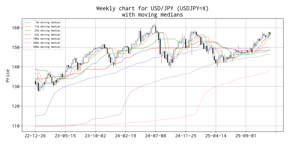 直近の移動メジアン線の値は、 9 週線 155.750 円、 13 週線 154.540 円、 26 週線 149.173 円、 52 週線 148.325 円(13 週連続)、 100 週線 150.035 円、 200 週線 146.485 円、 300 週線 138.203 円 でした。
