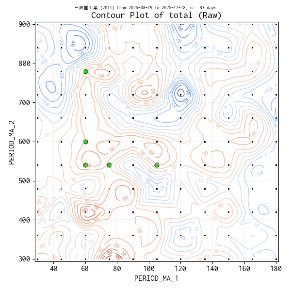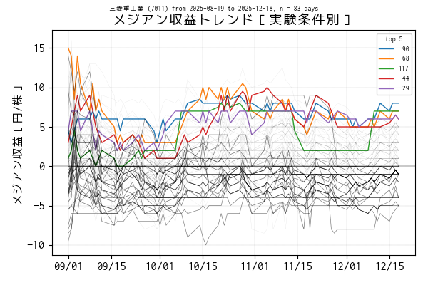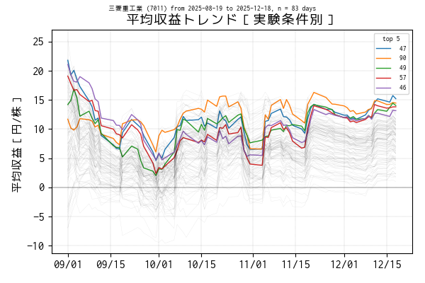 対象銘柄 7011 の場合、トレンドをプロットした 2025-09-01 以降の期間で、平均収益トップ 5 はどれもマイナス圏に沈むことなく概ね良好なトレンドを保っていますが、それでもトレンドの起伏には差があります。