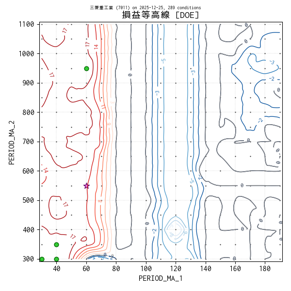 投稿線は、損益がプラスを赤系色、マイナスを青系色、0 を黒色で表示しています。また、実験点を ・、本日の条件を ★、本日損益が最も高かったベスト条件を ● で示しています。