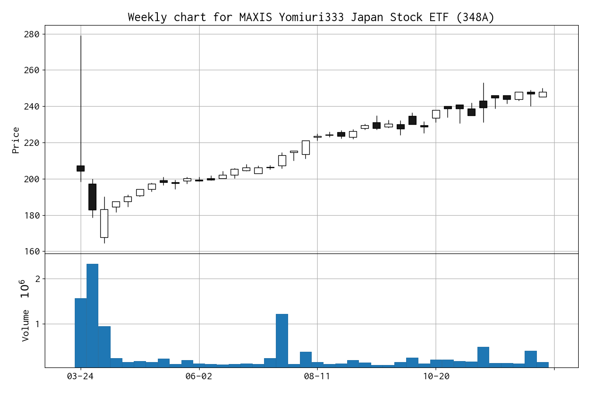 この読売株価指数に連動する上場投資信託 (ETF)、MAXIS読売333日本株上場投信(MXS読売333日株【略称】)(348A) が 3 月 27 日に東京証券取引所へ上場しました。週足のローソク足チャートを作成しました。