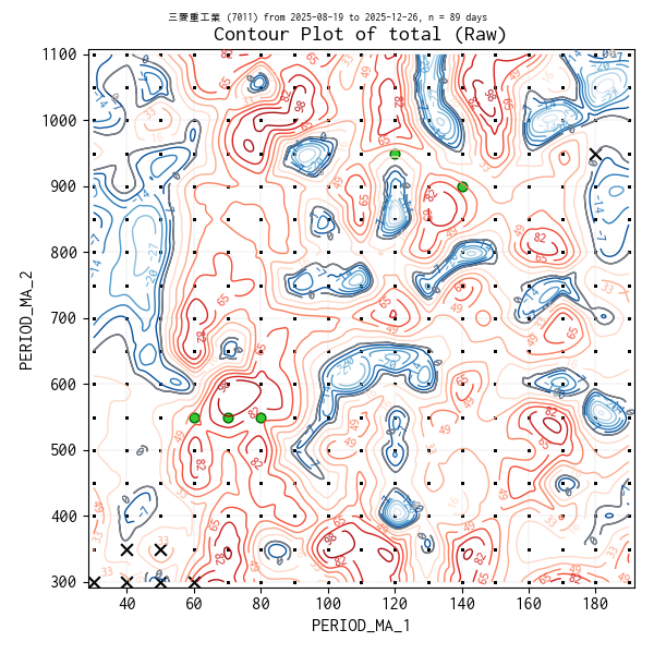 過去のティックデータを補完した等高線図を参考に作成しています。実験点は ・、平均損益トップ 5 の条件は 🟢(ただし、トップ 5 を大きく、他を小さくしています)、平均損益がマイナスになった条件があれば ✖ で表示しています。