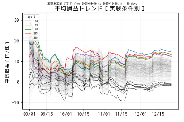 前営業日までを集計した平均損益でトップ 5 の条件は色を変えてプロットしています。一方、平均損益がマイナスになっている条件は黒の実線、その他は薄墨色でプロットしています。