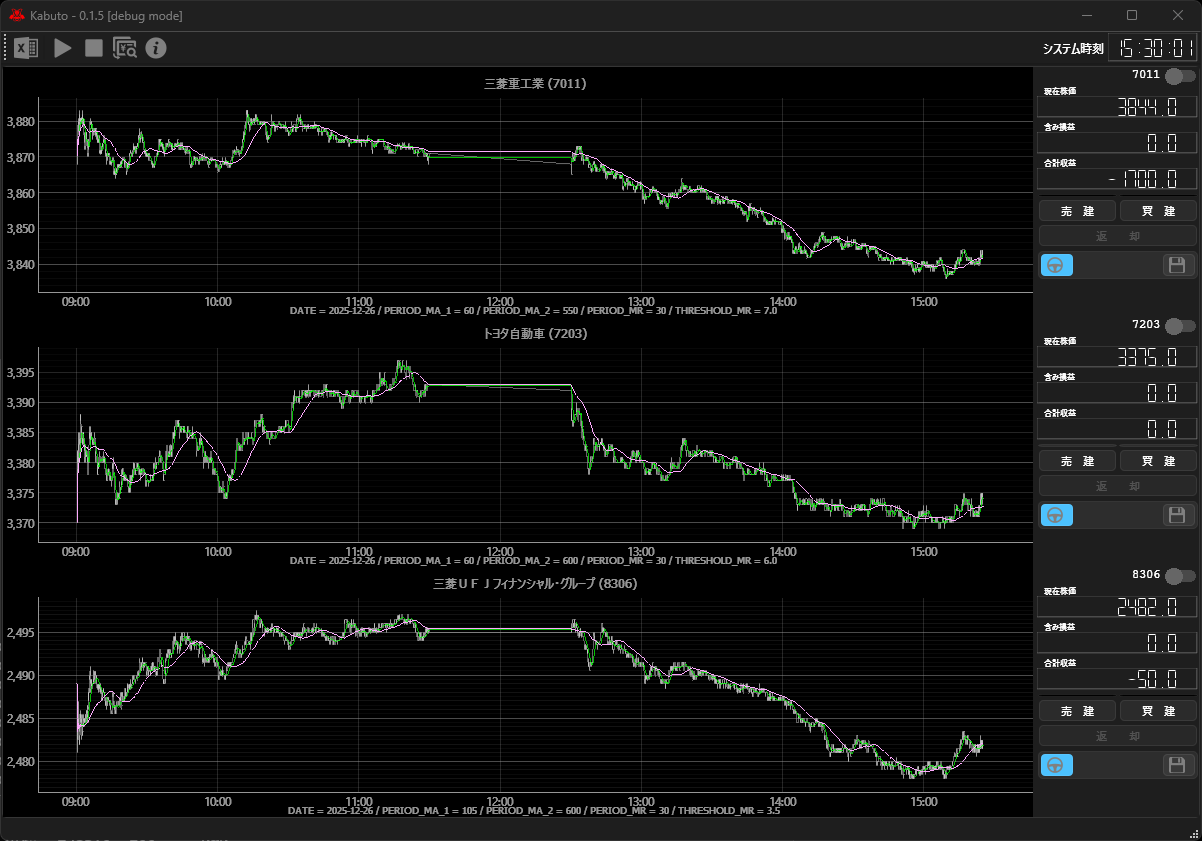 一度に扱える銘柄数の上限に制約を付けていませんが、実行環境として最初のターゲットにしている Intel N150 搭載の PC では、スクリーンショットのように、同時に 3 銘柄の取引を扱えれば上出来だと考えています。
