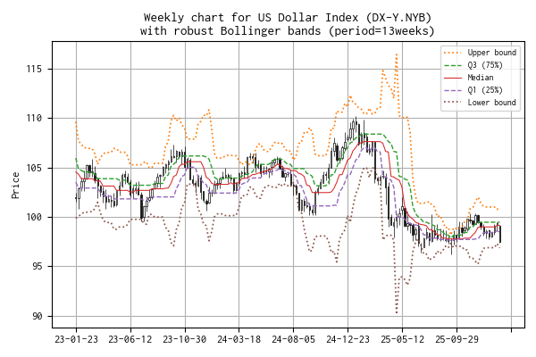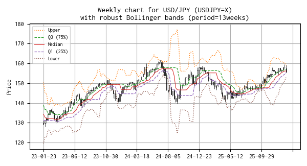 平均と標準偏差を、median と IQR(Q1 25% と Q3 75%)に置き換えたボリンジャーバンド(勝手に robust Bollinger bands と呼んでいます)のチャートを示しました。
