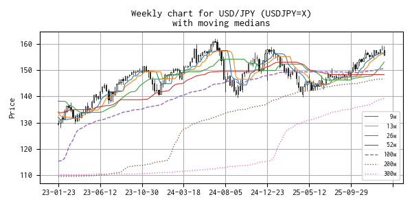 直近の移動メジアン線の値は、 9 週線 156.560 円、 13 週線 156.150 円、 26 週線 153.110 円、 52 週線 148.325 円(16 週連続)、 100 週線 150.602 円、 200 週線 146.734 円、 300 週線 139.255 円 でした。