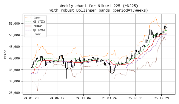 平均と標準偏差を、median と IQR(Q1 25% と Q3 75%)に置き換えたボリンジャーバンド(勝手に robust Bollinger bands と呼んでいます)のチャートを示しました。