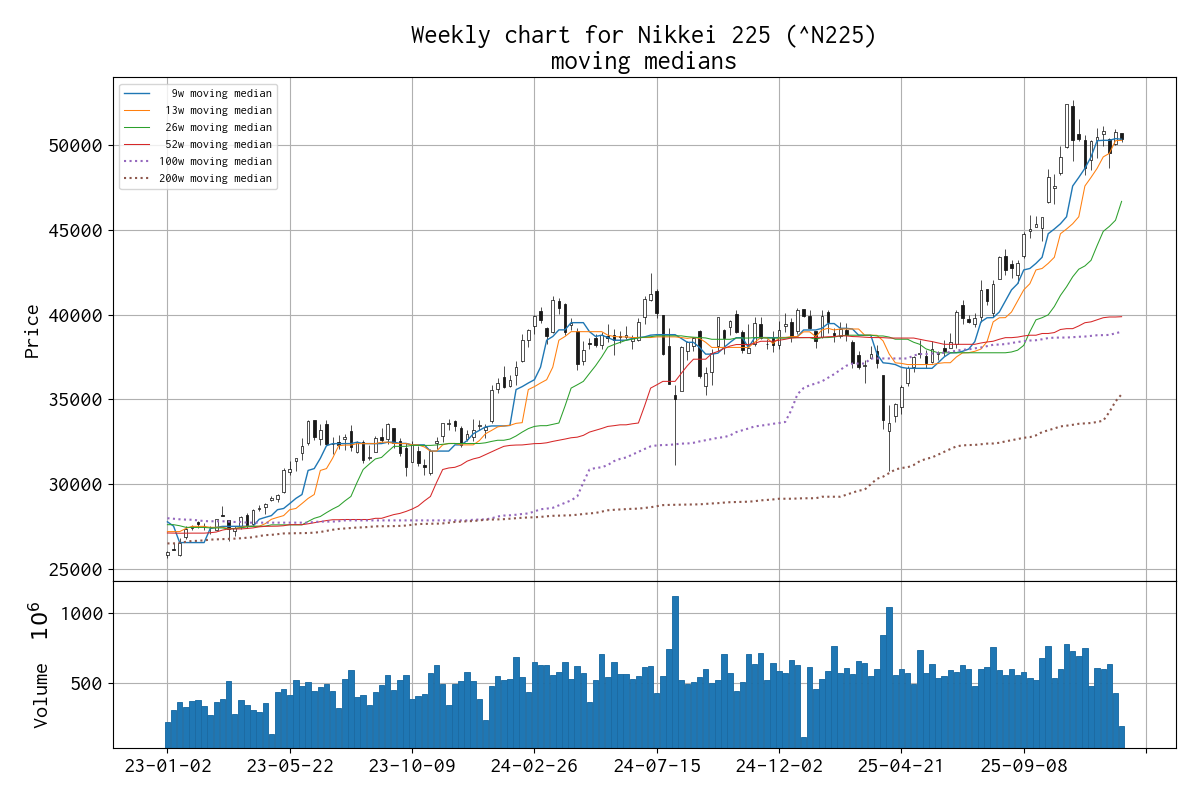 直近の移動メジアン線の値は、 9 週線 50,339 円、 13 週線 50,276 円、 26 週線 46,675 円、 52 週線 39,875 円、 100 週線 38,986 円、 200 週線 35,301 円 でした。