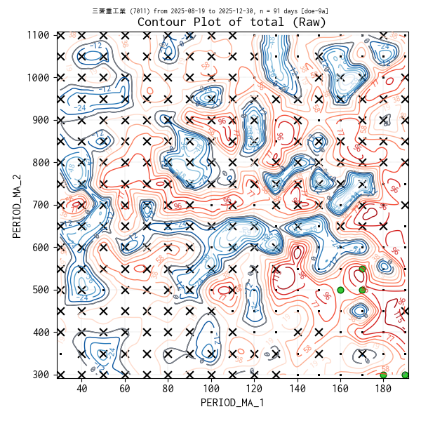 過去のティックデータを補完した等高線図を参考に作成しています。実験点は ・、平均損益トップ 5 の条件は 🟢(ただし、トップ 5 を大きく、他を小さくしています)、平均損益がマイナスになった条件があれば ✖ で表示しています。