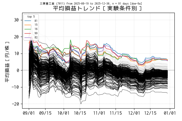 前営業日までを集計した平均損益でトップ 5 の条件は色を変えてプロットしています。一方、平均損益がマイナスになっている条件は黒の実線、その他は薄墨色でプロットしています。