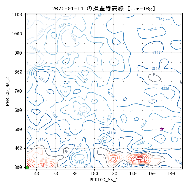 2026-01-14 のベスト条件 [doe-10g] PERIOD_MA_1 PERIOD_MA_2 取引回数 損益 0 30 300 100 5900.0