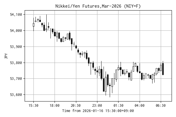 今朝の CME 日経先物 円建て は 53,725 円で引けました(先週末 53,565 円)。