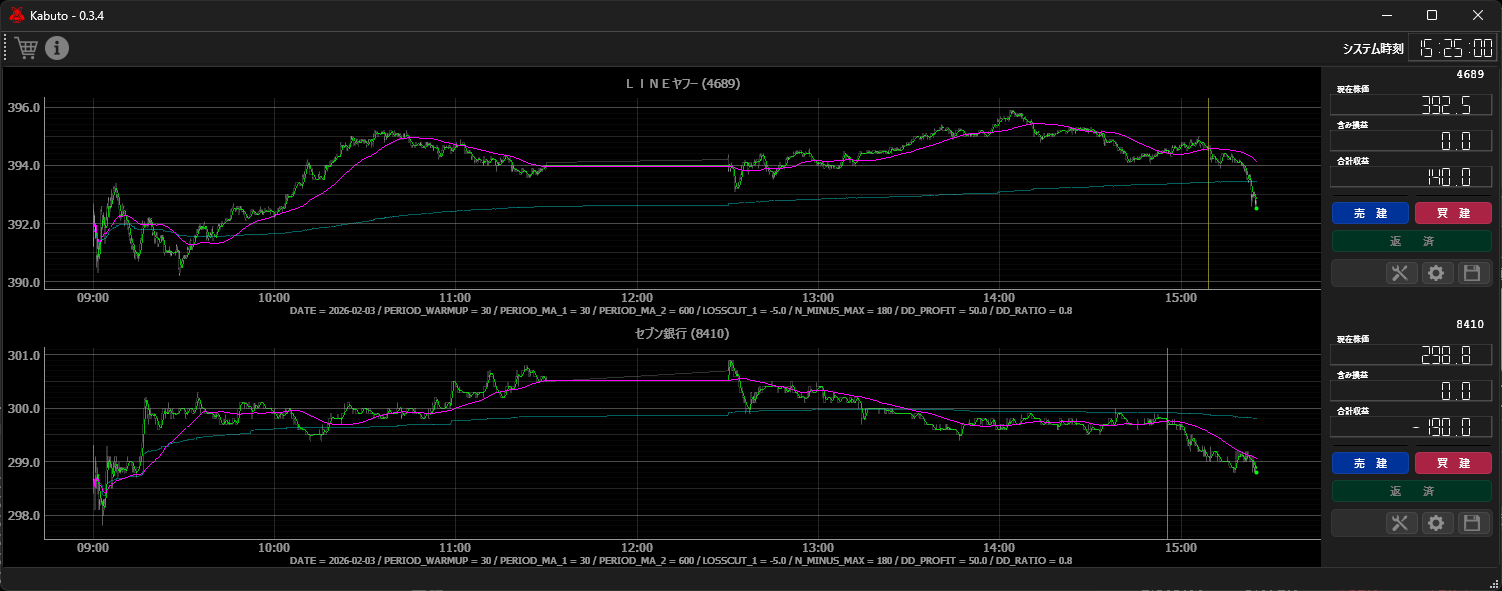 今日は複数銘柄のチャートを表示して取引しました。また、ティックデータとして株価と共に収集している累積出来高の情報を使って VWAP を算出して、チャートにトレンドを表示するようにしました。