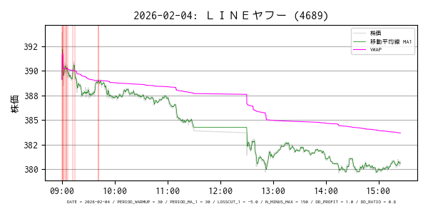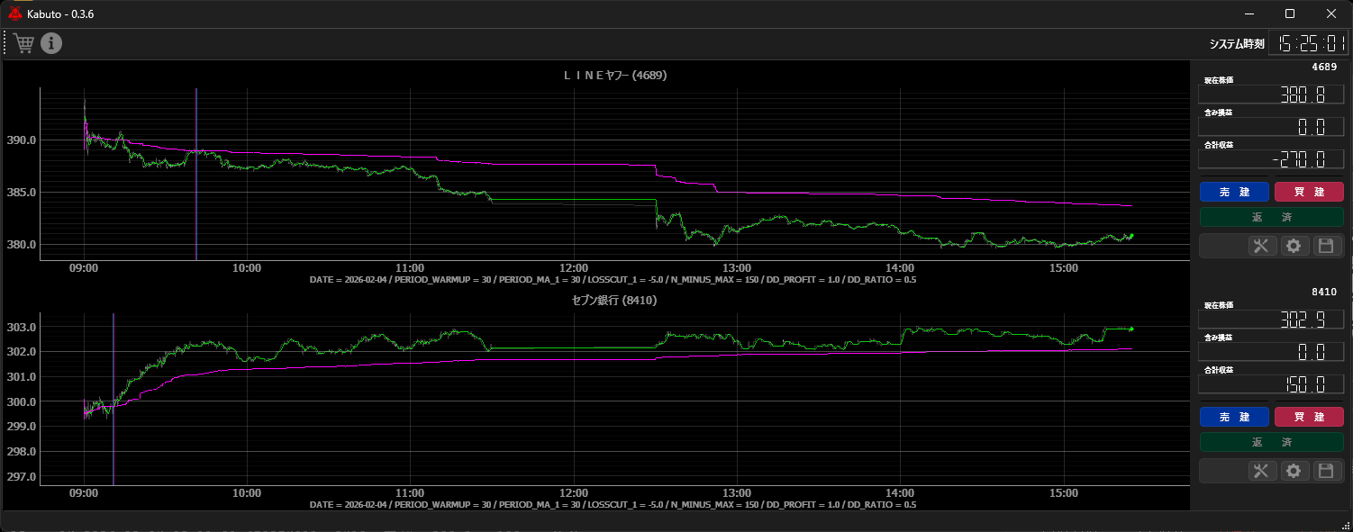 LINEヤフー (4689) はマイナスになってしまいました。トレーリング・ストップに引っかかってしまって、マイナスのまま前場早いうちに終了しました。トレーリング・ストップがちゃんと効くことを確認できましたが、こんなところでという場面で効いてしまいました。含み益の変動に対してもっと粘れるようにパラメータを調節しました。