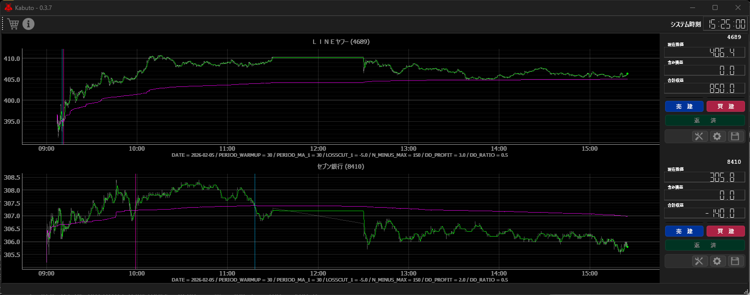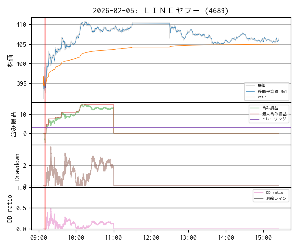 LINEヤフー (4689) はエントリがうまくいかず、いきなりバカヨケ (fool proof) 的なロスカットのしきい値に引っかかってマイナス・スタート。今日は 9:07 過ぎまで寄らなかったためか、寄った後、ロスカットに引っかかるような値動きが激しい時にうっかりエントリしてしまいました。その後 1 回のエントリでトレンドに乗れたので傷口を広げずに済みました。