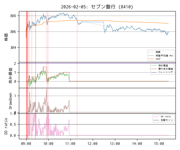 セブン銀行 (8410) の方は無駄なエントリを重ねてマイナス・スタートになりました。その上、値動きが乏しくてマイナスを挽回できそうになかったので 11 時前に諦めて建玉を返済しました。